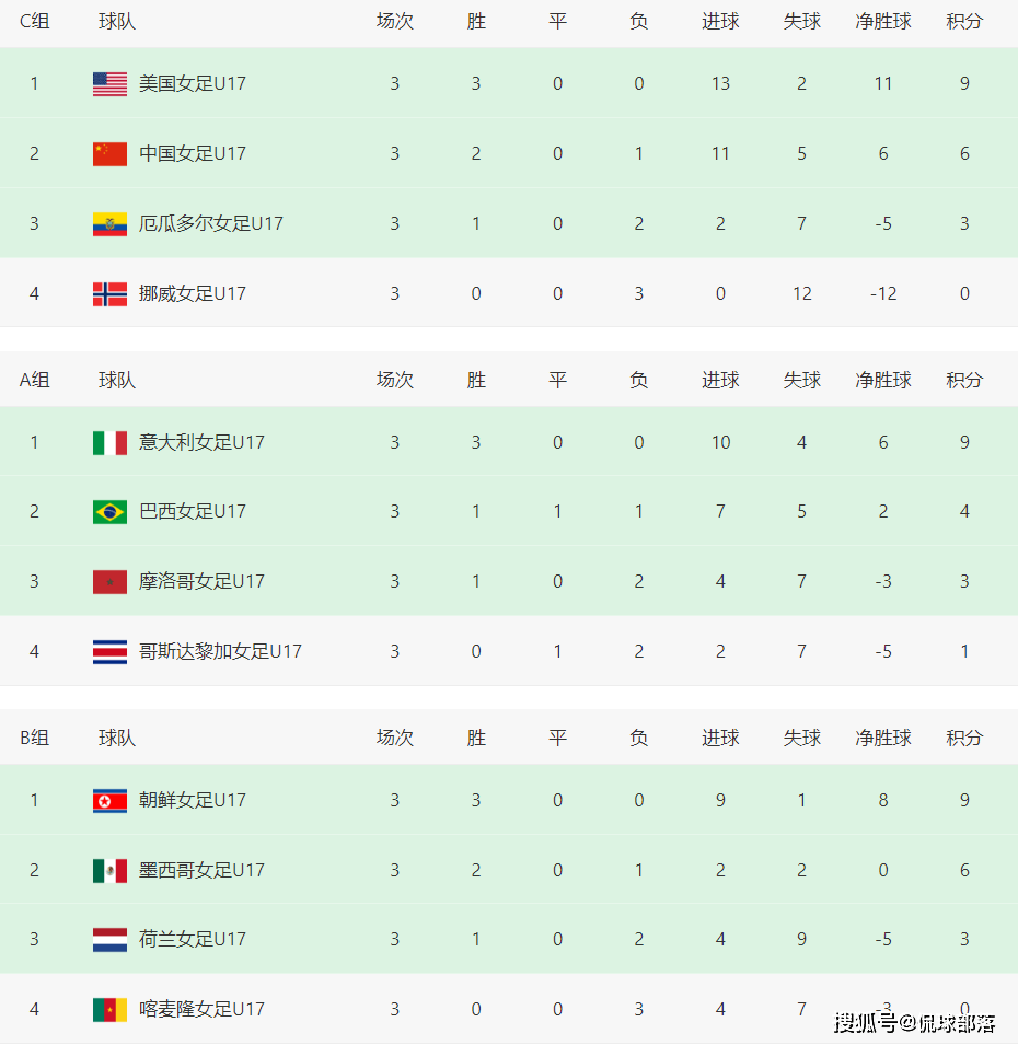 这个比赛日,A组、B组、C组的六场比赛全部结束,三个小组最终积分榜如下:
