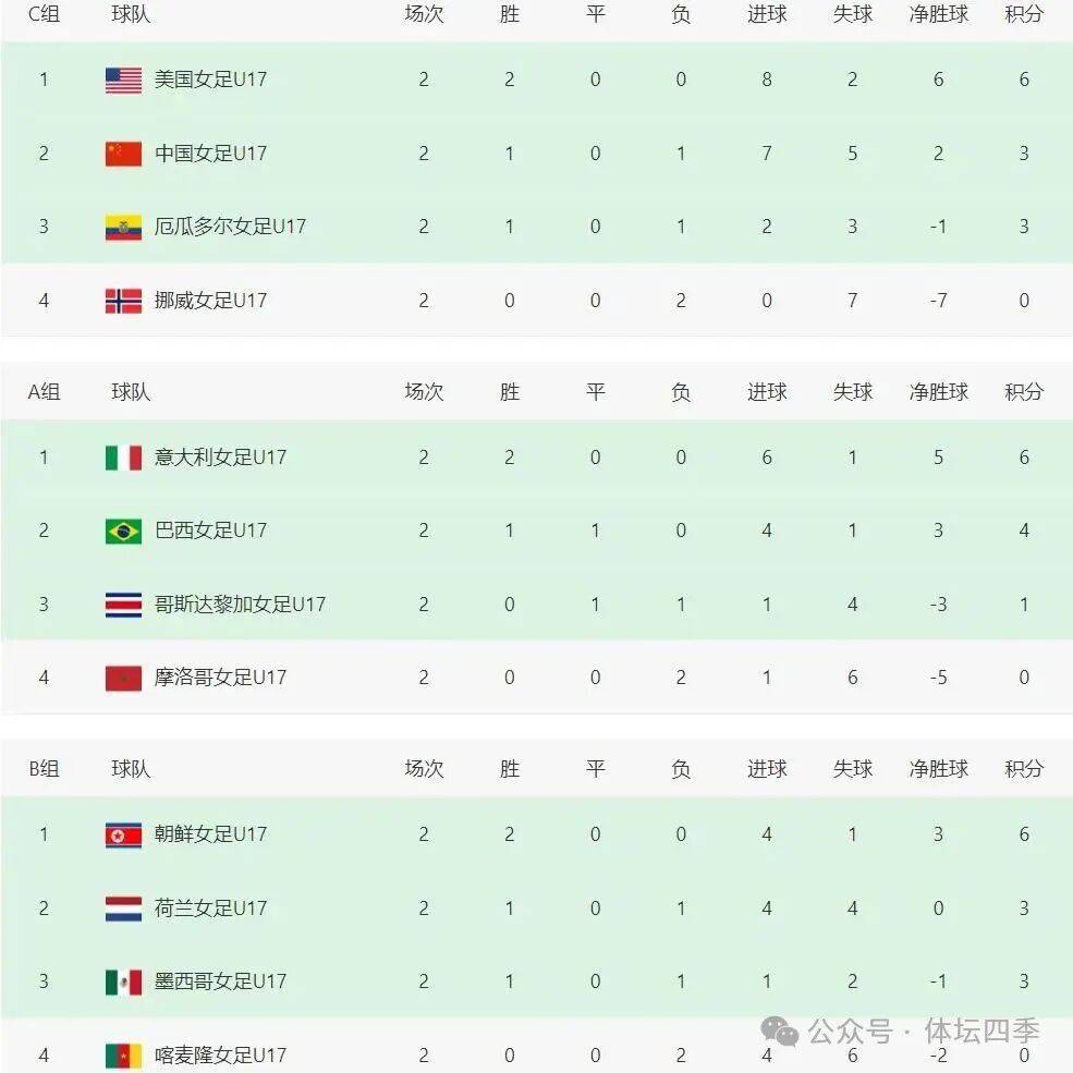 F组的日本以2-0击败赞比亚,巴拉圭则以4-1战胜新西兰,同样提前一轮出线。赞比亚和新西兰连续两场失利积零分,小组第三名最多也只有3分,净胜球同样落后中国女足。