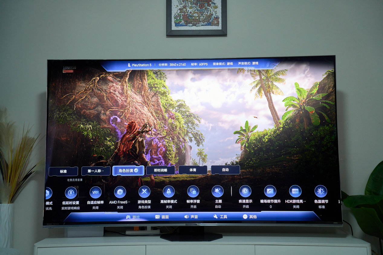 针对不同类型的游戏,电视内置了标准、FPS、RPG、RTS 和体育等五种专属模式,玩家无需手动调节参数,电视会根据游戏类型自动优化画面响应速度与色彩表现。