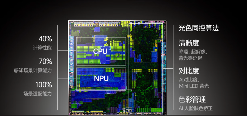 该芯片采用 RISC-V开放架构,CPU 单核性能提升 40%,感知场景计算能力提升 70%,可实时分析画面中的场景类型、色彩分布与亮度变化,智能匹配优化方案。