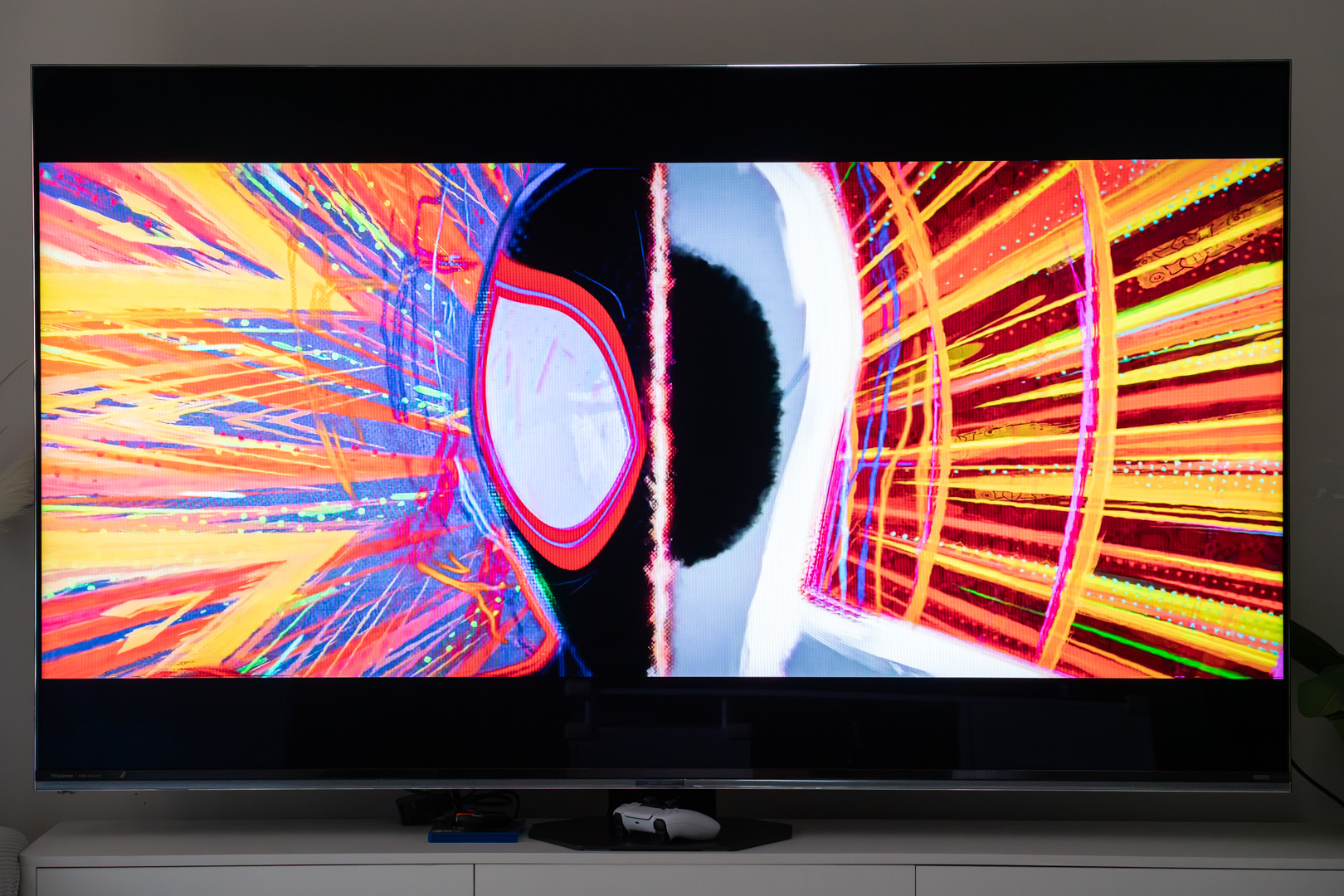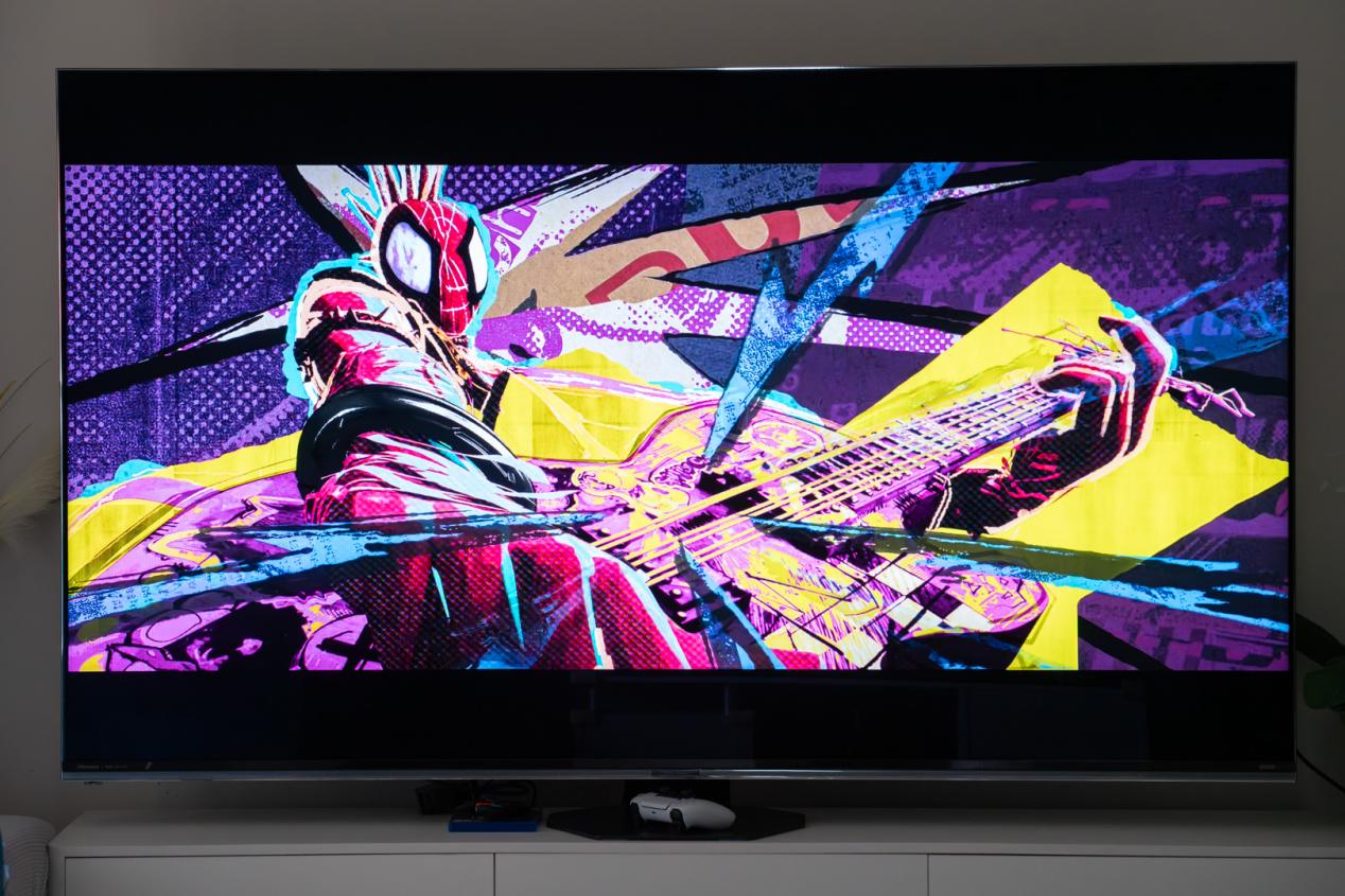 而在播放电影时,小雷选择了十分考验电视显示效果的「蜘蛛侠:纵横宇宙」,可以看到不同宇宙中呈现的不同主题色来回切换时,没有出现任何的色彩断层,且整体过渡十分流畅,让原本艺术感就拉满的电影更具艺术张力。