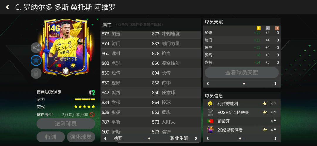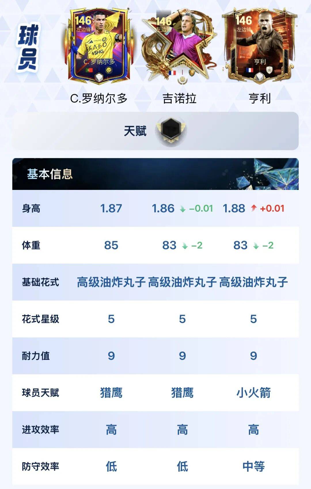 在没有天赋加成的数据中,C罗的控球、冲刺速度、反应、远射等多项锋线以上的数值,整体数据强度虽然对比同级别热门球员有一定不足,但也没有明显短板。