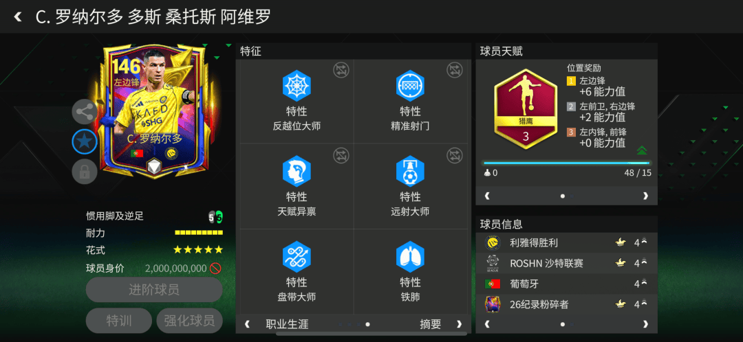 C罗配备了大力任意球、铁人、反越位大师、精准射门、天赋异禀、远射大师、盘带大师、铁肺八项特性。