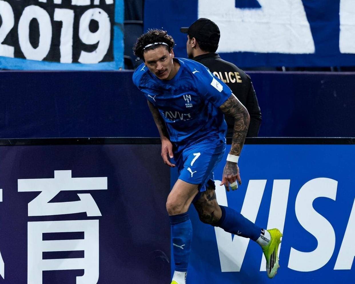 比赛第8分钟就出现争议,利雅得新月球员马里犯规放倒对手,阿布扎比统一球员认为这是红牌动作,围住马宁申诉。 马宁在观看VAR后维持了黄牌的原判。 第19分钟,利雅得新月获得前场任意球机会,葡萄牙球星鲁本·内维斯主罚,他将球旋向后点,26岁的乌拉圭前锋努涅斯力压防守球员,一记势大力沉的头球攻门,皮球砸入网窝! 利雅得新月1-0领先。
