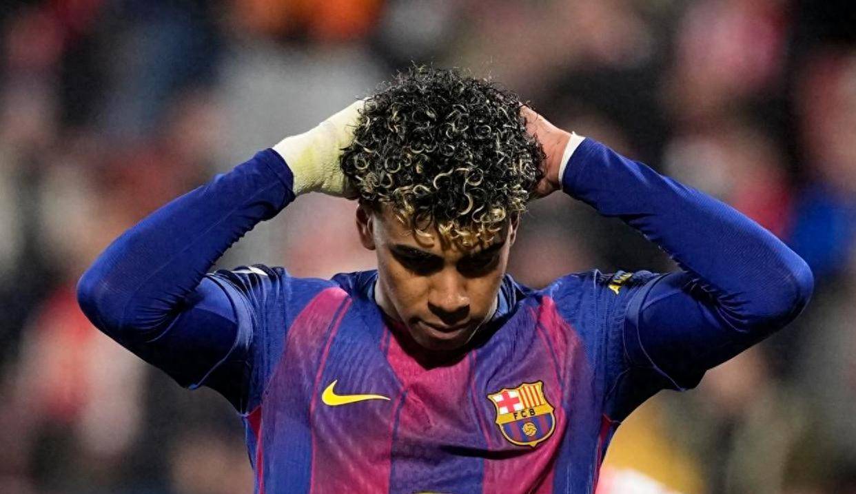 上半场快结束的时候,巴萨连续错过绝佳机会。 第43分钟,拉菲尼亚的射门重重砸在立柱上弹出。 补时第3分钟,奥尔莫在禁区内被放倒,裁判判罚点球。 站在点球点前的是巴萨的当红新星亚马尔,他本赛季已经多次主罚点球。 然而,他踢出的皮球又一次击中了立柱! 巴萨带着0-0的比分进入中场休息,两个门柱让全队士气受挫。