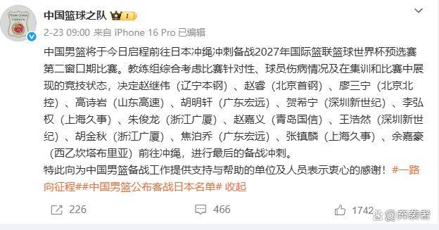 2月23日上午,最终的14人出征名单公布:后卫赵睿、赵继伟、廖三宁、高诗岩、胡明轩、贺希宁;锋线张镇麟、朱俊龙、王浩然、李弘权、赵嘉义;内线胡金秋、焦泊乔、余嘉豪。 这份名单背后是多名核心球员的缺阵:绝对主力周琦因眼伤和腰伤未进集训名单;锋线希望之星曾凡博因膝盖严重积水无奈退出;后卫徐杰也因脚踝伤势落选。